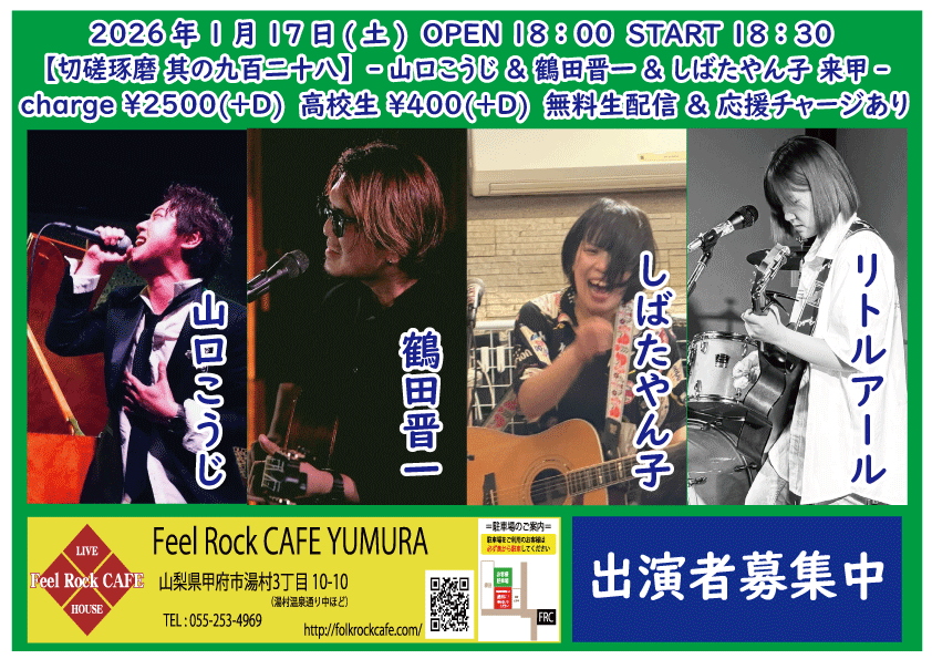 OPEN 18:00START 18:30 チケット前売り ¥2500(+D¥600) 高校生 ¥400(+D¥600) チケット当日 ¥2500(+D¥600) 高校生 ¥400(+D¥600) [出演] ①18:30-19:15 しばたやん子(大阪) ②19:20-20:05 鶴田晋一(大阪) ③20:10-20:55 山口こうじ(北海道) ④21:00-21:45 リトルアール 無料生配信 https://twitcasting.tv/feelrockcafe 応援チャージ・ドリンク差し入れ (アーカイブ視聴可能な合言葉を送ります) https://x.gd/ueo3h 【チケット予約】 2026-01-23 (金) 【切磋琢磨】-THE NATURAL KILLERS & 飛知和恵次 来甲-
