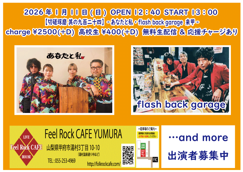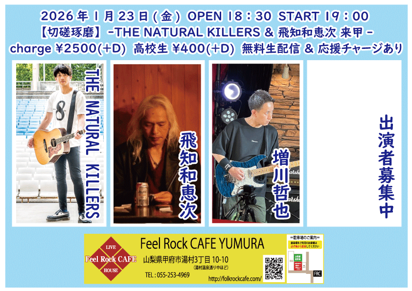 OPEN 12:40START 13:00 チケット前売り ¥2500(+D¥600) 高校生 ¥400(+D¥600) チケット当日 ¥2500(+D¥600) 高校生 ¥400(+D¥600) 出演] あなたと私(長野) FLASH BACK GARAGE(長野) …and more!!! 無料生配信&応援チャージ・ドリンク差し入れあり 【チケット予約】 2026-01-23 (金) 【切磋琢磨】-THE NATURAL KILLERS & 飛知和恵次 来甲-