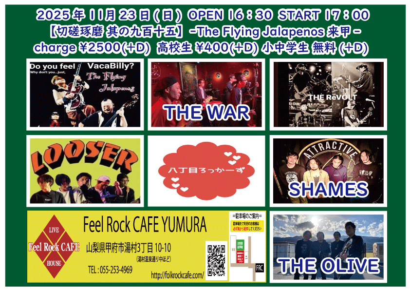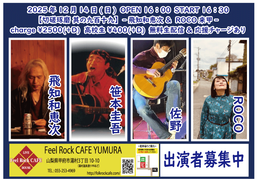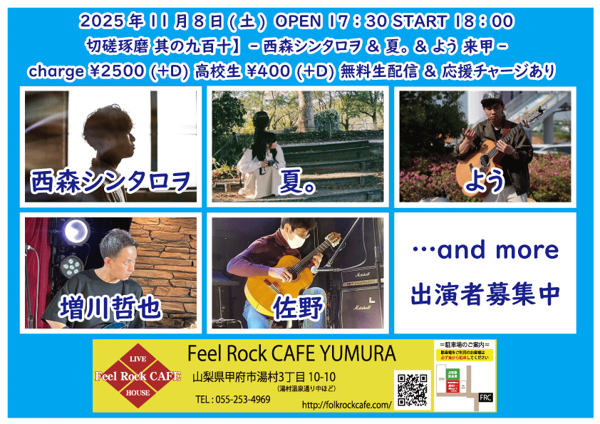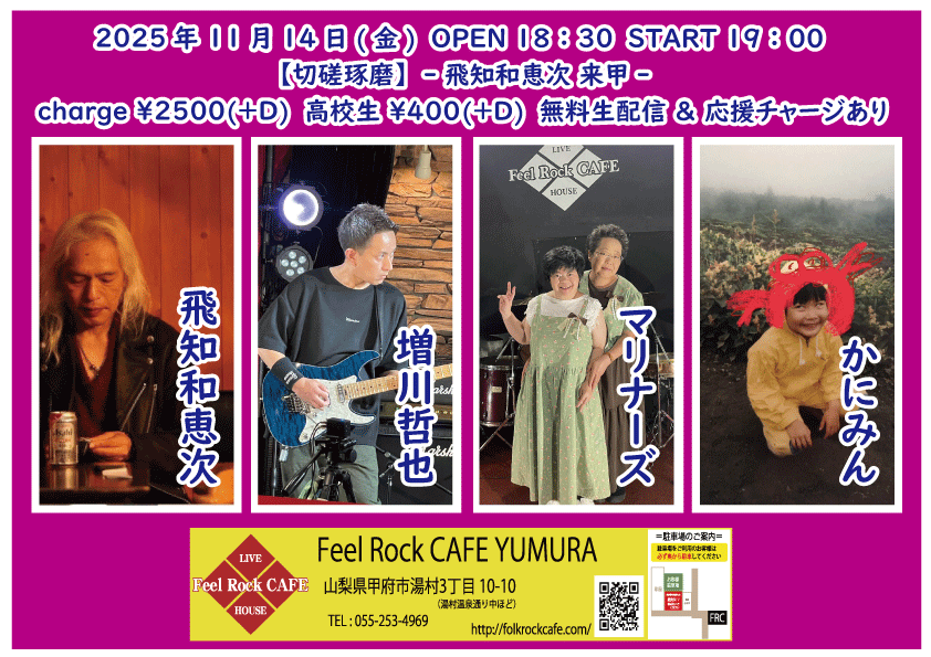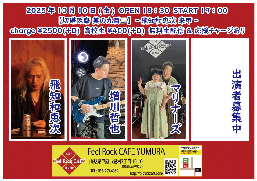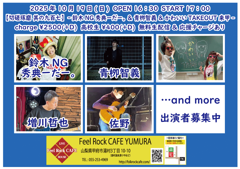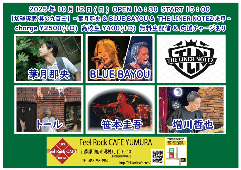 2025-10-10 (金) 【切磋琢磨 其の九百二】-飛知和恵次 来甲-![]() START 19:00 チケット前売り ¥2500(+D¥600) 高校生 ¥400(+D¥600) チケット当日 ¥2500(+D¥600) 高校生 ¥400(+D¥600) [出演] 飛知和恵次(静岡) マリナーズ 増川哲也 …and more!!! 無料生配信 https://twitcasting.tv/feelrockcafe 応援チャージ・ドリンク差し入れあり (アーカイブ視聴可能な合言葉を送ります) 小中学生はドリンク代¥600のみ 未就学児は無料(ドリンク任意) 【チケット予約】 2025-10-11 (土) 【切磋琢磨 其の九百三】-極楽ドルチェ & 代官山パンク日和 & 月ノ雫 来甲-![]() START 17:00 チケット前売り ¥2500(+D¥600) 高校生 ¥400(+D¥600) チケット当日 ¥2500(+D¥600) 高校生 ¥400(+D¥600) [出演] 極楽ドルチェ(東京) 代官山パンク日和(東京) 月ノ雫(東京) 八丁目ロッカーズ 中込 TEXAS WOOD BROS. ゴンタ3号 こーたろー 配信あり 【チケット予約】 2025-10-12 (日) 【切磋琢磨 其の九百四】-葉月那央 & BLUE BAYOU 来甲-![]() START 15:00 チケット前売り ¥2500(+D¥600) 高校生 ¥400(+D¥600) チケット当日 ¥2500(+D¥600) 高校生 ¥400(+D¥600) ①15:00-15:30 笹本圭吾 ②15:35-16:05 THE LINER NOTEZ(東京) ③16:10-16:40 増川哲也 ④16:45-17:15 BLUE BAYOU(優&YJH/静岡) ⑤17:20-17:50 トール ⑥17:55-18:35 葉月那央(群馬) 無料生配信 https://twitcasting.tv/feelrockcafe 応援チャージ・ドリンク差し入れあり (アーカイブ視聴可能な合言葉を送ります) https://x.gd/ppc91 小中学生はドリンク代¥600のみ 未就学児は無料(ドリンク任意) 【チケット予約】 2025-10-14 (火) 【切磋琢磨 其の九百四】-鶴田晋一 &タイツキのYaji & MIYA オーナー's TOUR-![]() START 19:00 チケット前売り ¥2500(+D¥600) 高校生 ¥400(+D¥600) チケット当日 ¥2500(+D¥600) 高校生 ¥400(+D¥600) [出演] ①19:00-19:30 永宮仁志 ②19:35-20:05 タイツキのYaji(久米川) ③20:10-20:40 でこ ④20:45-21:15 aro ⑤21:20-21:50 鶴田晋一(大阪) ⑥21:55-22:25 MIYA 無料生配信 https://twitcasting.tv/feelrockcafe 応援チャージ・ドリンク差し入れ (アーカイブ視聴可能な合言葉を送ります) https://passmarket.yahoo.co.jp/event/show/detail/02mbsnw769f41.html 【チケット予約】 2025-10-17 (金) 【切磋琢磨 其の九百六】-新船将徳 来甲-![]() START 19:00 チケット前売り ¥2500(+D¥600) 高校生 ¥400(+D¥600) チケット当日 ¥2500(+D¥600) 高校生 ¥400(+D¥600) [出演] ①19:00-19:35 (35) かにみん ②19:40-20:15 (35) 慎也 ③20:20-20:55 (35) Chia ④21:00-21:35 (35) 永瀬楓 ⑤21:40-22:30 (50) 新船将徳(横浜) 無料生配信 https://twitcasting.tv/feelrockcafe 応援チャージ・ドリンク差し入れあり (アーカイブ視聴可能な合言葉を送ります) https://x.gd/qnX2Z 小中学生はドリンク代¥600のみ 未就学児は無料(ドリンク任意) 【チケット予約】 2025-10-19 (日) 【切磋琢磨 其の九百七】-鈴木NG秀典ーだー。& 青栁智義 & かわいいTAKEOUT 来甲-![]() START 17:00 チケット前売り ¥2500(+D¥600) 高校生 ¥400(+D¥600) チケット当日 ¥2500(+D¥600) 高校生 ¥400(+D¥600) [出演] 鈴木NG秀典ーだー。(静岡) 青栁智義(横浜) かわいいTAKEOUT(愛知/静岡) 佐野 増川哲也 …and more!!! 無料生配信&応援チャージ・ドリンク差し入れあり 【チケット予約】 2025-10-25 (土) 【切磋琢磨 其の九百八】-高沢渓太レコ発ツアー & 怜音ーREONー & 荒牧リョウ 来甲 -![]() START 18:00 チケット前売り ¥2500(+D¥600) 高校生 ¥400(+D¥600) チケット当日 ¥2500(+D¥600) 高校生 ¥400(+D¥600) [出演] ①18:00-18:30 リトルアール ②18:35-19:05 怜音ーREONー(千葉) ③19:10-19:40 佐野 ④19:45-20:15 トール ⑤20:20-21:00 荒牧リョウ(東京) ⑥21:05-21:45 高沢渓太(千葉) 無料生配信 https://twitcasting.tv/feelrockcafe 応援チャージ・ドリンク差し入れあり (アーカイブ視聴可能な合言葉を送ります) https://passmarket.yahoo.co.jp/event/show/detail/020nqnj1x8n41.html 小中学生はドリンク代¥600のみ 未就学児は無料(ドリンク任意) 【チケット予約】 2025-10-26 (日) 【Otto Junior Band & Ryota Goto Live tour in japan 2025】![]() START 19:00 チケット前売り ¥4000(+D¥600) チケット当日 ¥4000(+D¥600) [出演] Otto Junior Band & Ryota Goto 【チケット予約】 2025-10-31 (金) 【㊗Bトラクターズ 結成30周年 スペシャルLIVE】![]() START 19:00 チケット前売り ¥1500(+D¥600) 高校生 ¥500 チケット当日 ¥2000(+D¥600) 高校生 ¥500 [出演] Bトラクターズ 【チケット予約】 2025-11-01 (土) 「Piece The Music vol.22」~Yamanashi special~![]() START 17:30 チケット前売り ¥3000(+D¥600) チケット当日 ¥3500(+D¥600) [出演] heana 常盤侑希 高尾彩佳 朝倉くるみ YURIKA 小豆沢あずき feat. DJ AKISUKE 加藤大吾 有料配信 ¥1650(パスマーケット手数料込み) https://x.gd/u2K3w 【チケット予約】 2025-11-02 (日) <中島卓偉 弾き語りTOUR ALL AROUND THE JAPAN 〜Season3〜>![]() START 14:00 チケット前売り SOLD OUT チケット当日 なし ※整理番号付き・全自由席 ※年齢制限3歳以上有料 こちらのチケット予約は受け付けておりません。 【チケット予約】 2025-11-07 (金) 【切磋琢磨 其の九百九】 -鈴木大夢 & いとうさくら & あおしぐれ 来甲-![]() START 19:00 チケット前売り ¥2500(+D¥600) 高校生 ¥400(+D¥600) チケット当日 ¥2500(+D¥600) 高校生 ¥400(+D¥600) [出演] ①19:00-19:30 トール ②19:35-20:10 あおしぐれ(横浜) ③20:15-20:45 増川哲也 ④20:50-21:25 いとうさくら(三重) ⑤21:30-22:00 慎也 ⑥22:05-22:40 