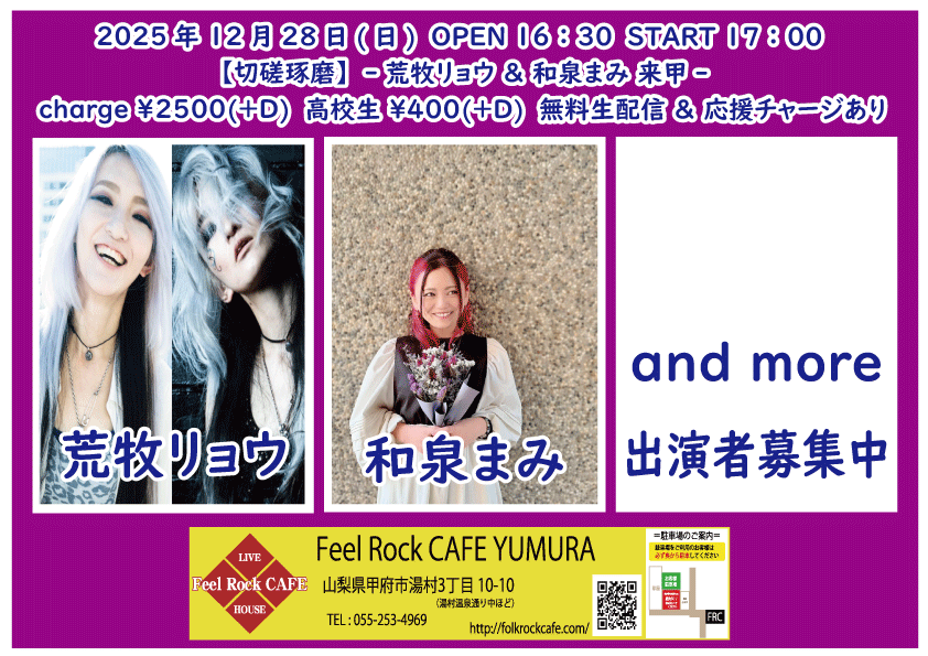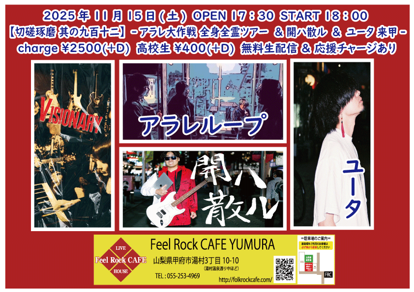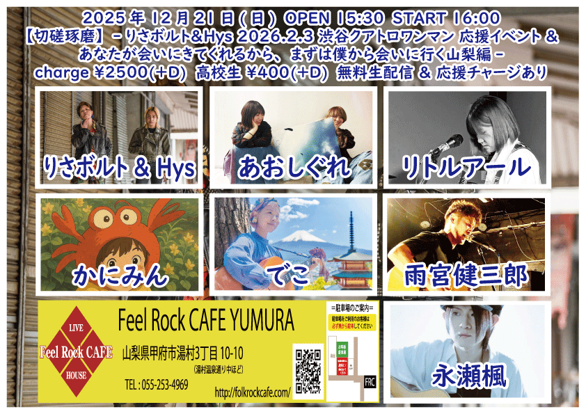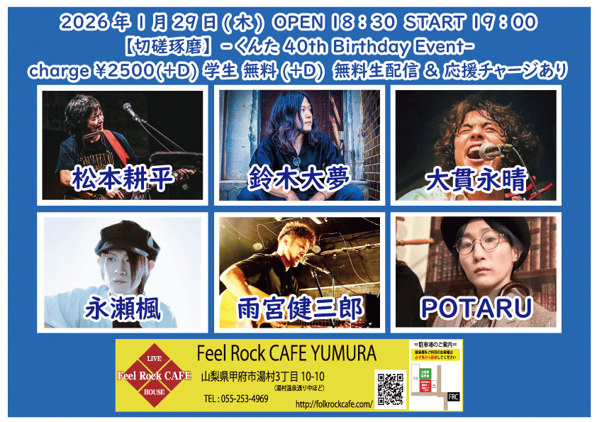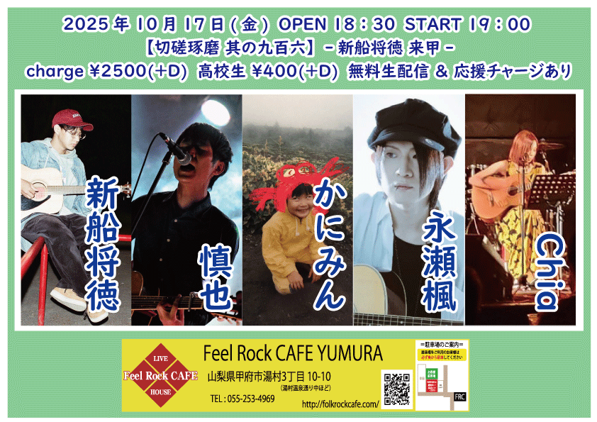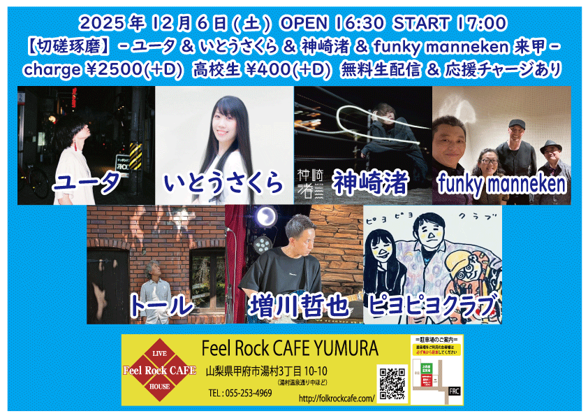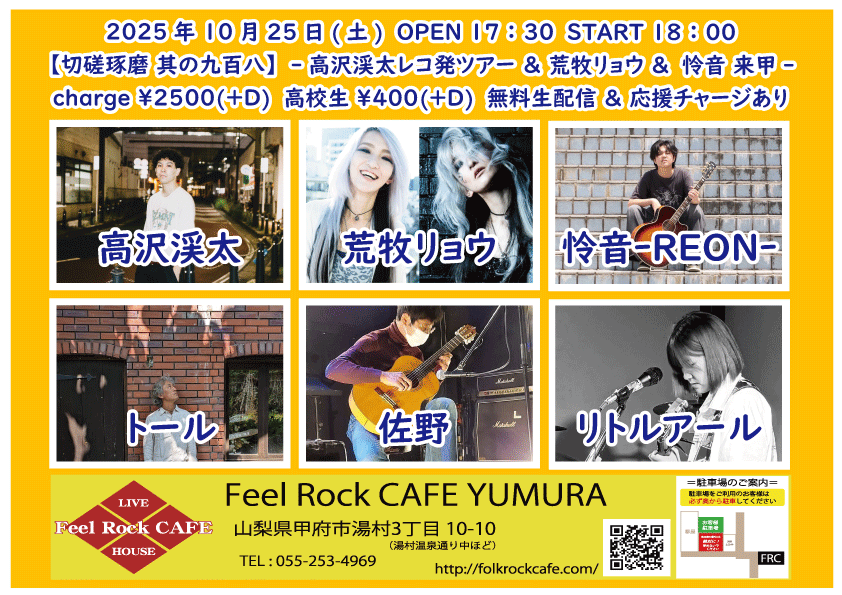 2025-10-10 (金) 【切磋琢磨 其の九百二】-飛知和恵次 来甲-![]() START 19:00 チケット前売り ¥2500(+D¥600) 高校生 ¥400(+D¥600) チケット当日 ¥2500(+D¥600) 高校生 ¥400(+D¥600) [出演] 飛知和恵次(静岡) マリナーズ 増川哲也 …and more!!! 無料生配信 https://twitcasting.tv/feelrockcafe 応援チャージ・ドリンク差し入れあり (アーカイブ視聴可能な合言葉を送ります) 小中学生はドリンク代¥600のみ 未就学児は無料(ドリンク任意) 【チケット予約】 2025-10-11 (土) 【切磋琢磨 其の九百三】-極楽ドルチェ & 代官山パンク日和 & 月ノ雫 来甲-![]() START 17:00 チケット前売り ¥2500(+D¥600) 高校生 ¥400(+D¥600) チケット当日 ¥2500(+D¥600) 高校生 ¥400(+D¥600) [出演] 極楽ドルチェ(東京) 代官山パンク日和(東京) 月ノ雫(東京) 八丁目ロッカーズ 中込 TEXAS WOOD BROS. ゴンタ3号 こーたろー 配信あり 【チケット予約】 2025-10-12 (日) 【切磋琢磨 其の九百四】-葉月那央 & BLUE BAYOU 来甲-![]() START 15:00 チケット前売り ¥2500(+D¥600) 高校生 ¥400(+D¥600) チケット当日 ¥2500(+D¥600) 高校生 ¥400(+D¥600) ①15:00-15:30 笹本圭吾 ②15:35-16:05 THE LINER NOTEZ(東京) ③16:10-16:40 増川哲也 ④16:45-17:15 BLUE BAYOU(優&YJH/静岡) ⑤17:20-17:50 トール ⑥17:55-18:35 葉月那央(群馬) 無料生配信 https://twitcasting.tv/feelrockcafe 応援チャージ・ドリンク差し入れあり (アーカイブ視聴可能な合言葉を送ります) https://x.gd/ppc91 小中学生はドリンク代¥600のみ 未就学児は無料(ドリンク任意) 【チケット予約】 2025-10-14 (火) 【切磋琢磨 其の九百四】-鶴田晋一 &タイツキのYaji & MIYA オーナー's TOUR-![]() START 19:00 チケット前売り ¥2500(+D¥600) 高校生 ¥400(+D¥600) チケット当日 ¥2500(+D¥600) 高校生 ¥400(+D¥600) [出演] ①19:00-19:30 永宮仁志 ②19:35-20:05 タイツキのYaji(久米川) ③20:10-20:40 でこ ④20:45-21:15 aro ⑤21:20-21:50 鶴田晋一(大阪) ⑥21:55-22:25 MIYA 無料生配信 https://twitcasting.tv/feelrockcafe 応援チャージ・ドリンク差し入れ (アーカイブ視聴可能な合言葉を送ります) https://passmarket.yahoo.co.jp/event/show/detail/02mbsnw769f41.html 【チケット予約】 2025-10-17 (金) 【切磋琢磨 其の九百六】-新船将徳 来甲-![]() START 19:00 チケット前売り ¥2500(+D¥600) 高校生 ¥400(+D¥600) チケット当日 ¥2500(+D¥600) 高校生 ¥400(+D¥600) [出演] ①19:00-19:35 (35) かにみん ②19:40-20:15 (35) 慎也 ③20:20-20:55 (35) Chia ④21:00-21:35 (35) 永瀬楓 ⑤21:40-22:30 (50) 新船将徳(横浜) 無料生配信 https://twitcasting.tv/feelrockcafe 応援チャージ・ドリンク差し入れあり (アーカイブ視聴可能な合言葉を送ります) https://x.gd/qnX2Z 小中学生はドリンク代¥600のみ 未就学児は無料(ドリンク任意) 【チケット予約】 2025-10-19 (日) 【切磋琢磨 其の九百七】-鈴木NG秀典ーだー。& 青栁智義 & かわいいTAKEOUT 来甲-![]() START 17:00 チケット前売り ¥2500(+D¥600) 高校生 ¥400(+D¥600) チケット当日 ¥2500(+D¥600) 高校生 ¥400(+D¥600) [出演] 鈴木NG秀典ーだー。(静岡) 青栁智義(横浜) かわいいTAKEOUT(愛知/静岡) 佐野 増川哲也 …and more!!! 無料生配信&応援チャージ・ドリンク差し入れあり 【チケット予約】 2025-10-25 (土) 【切磋琢磨 其の九百八】-高沢渓太レコ発ツアー & 怜音ーREONー & 荒牧リョウ 来甲 -![]() START 18:00 チケット前売り ¥2500(+D¥600) 高校生 ¥400(+D¥600) チケット当日 ¥2500(+D¥600) 高校生 ¥400(+D¥600) [出演] ①18:00-18:30 リトルアール ②18:35-19:05 怜音ーREONー(千葉) ③19:10-19:40 佐野 ④19:45-20:15 トール ⑤20:20-21:00 荒牧リョウ(東京) ⑥21:05-21:45 高沢渓太(千葉) 無料生配信 https://twitcasting.tv/feelrockcafe 応援チャージ・ドリンク差し入れあり (アーカイブ視聴可能な合言葉を送ります) https://passmarket.yahoo.co.jp/event/show/detail/020nqnj1x8n41.html 小中学生はドリンク代¥600のみ 未就学児は無料(ドリンク任意) 【チケット予約】 2025-10-26 (日) 【Otto Junior Band & Ryota Goto Live tour in japan 2025】![]() START 19:00 チケット前売り ¥4000(+D¥600) チケット当日 ¥4000(+D¥600) [出演] Otto Junior Band & Ryota Goto 【チケット予約】 2025-10-31 (金) 【㊗Bトラクターズ 結成30周年 スペシャルLIVE】![]() START 19:00 チケット前売り ¥1500(+D¥600) 高校生 ¥500 チケット当日 ¥2000(+D¥600) 高校生 ¥500 [出演] Bトラクターズ 【チケット予約】 2025-11-01 (土) 「Piece The Music vol.22」~Yamanashi special~![]() START 17:30 チケット前売り ¥3000(+D¥600) チケット当日 ¥3500(+D¥600) [出演] heana 常盤侑希 高尾彩佳 朝倉くるみ YURIKA 小豆沢あずき feat. DJ AKISUKE 加藤大吾 有料配信 ¥1650(パスマーケット手数料込み) https://x.gd/u2K3w 【チケット予約】 2025-11-02 (日) <中島卓偉 弾き語りTOUR ALL AROUND THE JAPAN 〜Season3〜>![]() START 14:00 チケット前売り SOLD OUT チケット当日 なし ※整理番号付き・全自由席 ※年齢制限3歳以上有料 こちらのチケット予約は受け付けておりません。 【チケット予約】 2025-11-07 (金) 【切磋琢磨 其の九百九】 -鈴木大夢 & いとうさくら & あおしぐれ 来甲-![]() START 19:00 チケット前売り ¥2500(+D¥600) 高校生 ¥400(+D¥600) チケット当日 ¥2500(+D¥600) 高校生 ¥400(+D¥600) [出演] ①19:00-19:30 トール ②19:35-20:10 あおしぐれ(横浜) ③20:15-20:45 増川哲也 ④20:50-21:25 いとうさくら(三重) ⑤21:30-22:00 慎也 ⑥22:05-22:40 