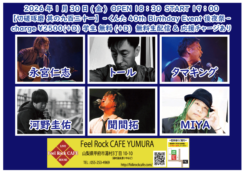 OPEN 18:30START 19:00 チケット前売り ¥2500(+D¥600) 学生 無料 チケット当日 ¥2500(+D¥600) 学生 無料 [出演] 松本耕平(日本) 鈴木大夢(名古屋) 大貫永晴(東京) 永瀬楓 雨宮健三郎 POTARU 無料生配信 < twitcasting.tv/feelrockcafe 応援チャージ・ドリンク差し入れ (アーカイブ視聴可能な合言葉を送ります) https://x.gd/iLvzf 【チケット予約】 2026-01-30 (金) 【切磋琢磨 其の九百三十一】 -くんた 40th Birthday Event 後夜祭-