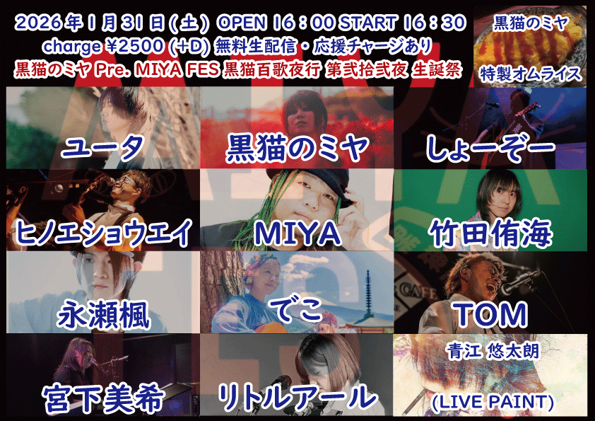 OPEN 18:30START 19:00 チケット前売り ¥2500(+D¥600) 学生 無料(+D¥600) チケット当日 ¥2500(+D¥600) 学生 無料(+D¥600) [出演] ①19:00-19:30 永宮仁志 ②19:35-20:05 トール ③20:10-20:40 タマキング ④20:45-21:15 河野圭佑 ⑤21:20-21:50 聞間拓 ⑥21:55-22:25 MIYA 無料生配信 https://twitcasting.tv/feelrockcafe 応援チャージ・ドリンク差し入れあり (アーカイブ視聴可能な合言葉を送ります) https://x.gd/8TcPJ 【チケット予約】 2026-01-31 (土) 黒猫のミヤ Presents【MIYA FES 黒猫百歌夜行 第弐拾弐夜 生誕祭】