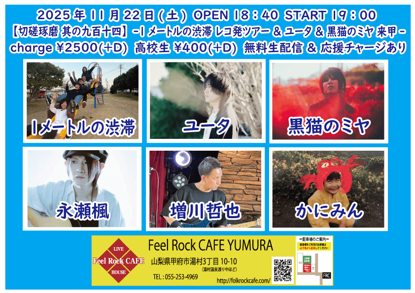 OPEN 18:40START 19:00 チケット前売り ¥2500(+D¥600) 高校生 ¥400(+D¥600) チケット当日 ¥2500(+D¥600) 高校生 ¥400(+D¥600) [出演] ①19:00-19:30 かにみん ②19:35-20:05 リトルアール ③20:10-20:40 増川哲也 ④20:45-21:15 ユータ(静岡) ⑤21:20-21:50 永瀬楓 ⑥22:00-22:30 1メートルの渋滞(静岡) 無料生配信 https://twitcasting.tv/feelrockcafe 応援チャージ・ドリンク差し入れ (アーカイブ視聴可能な合言葉を送ります) https://x.gd/ZCm4s 小中学生はドリンク代¥600のみ 未就学児は無料(ドリンク任意) 【チケット予約】 2025-11-23 (日) 【切磋琢磨 其の九百十五】-The Flying Jalapenos 来甲-
