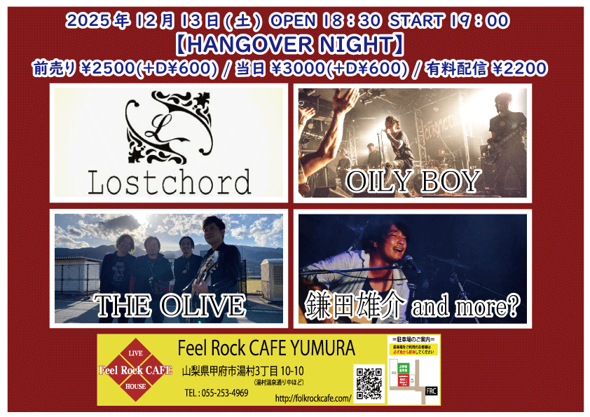 OPEN 18:30START 19:00 チケット前売り ¥2500(+D¥600) 高校生 ¥400(+D¥600) チケット当日 ¥2500(+D¥600) 高校生 ¥400(+D¥600) [出演] ①19:00-19:30 Elena(ex.あたりめ) ②19:35-20:10 MAI-YAN(新潟) ③20:15-20:45 増川哲也 ④20:50-21:25 小迫竜也(東京) ⑤21:30-22:00 慎也 ⑥22:05-22:40 新船将徳(横浜) 無料生配信 https://twitcasting.tv/feelrockcafe 応援チャージ・ドリンク差し入れ (アーカイブ視聴可能な合言葉を送ります) https://x.gd/FFEx4 小中学生はドリンク代¥600のみ 未就学児は無料(ドリンク任意) 【チケット予約】 2025-12-13 (土) 【HANGOVER NIGHT】