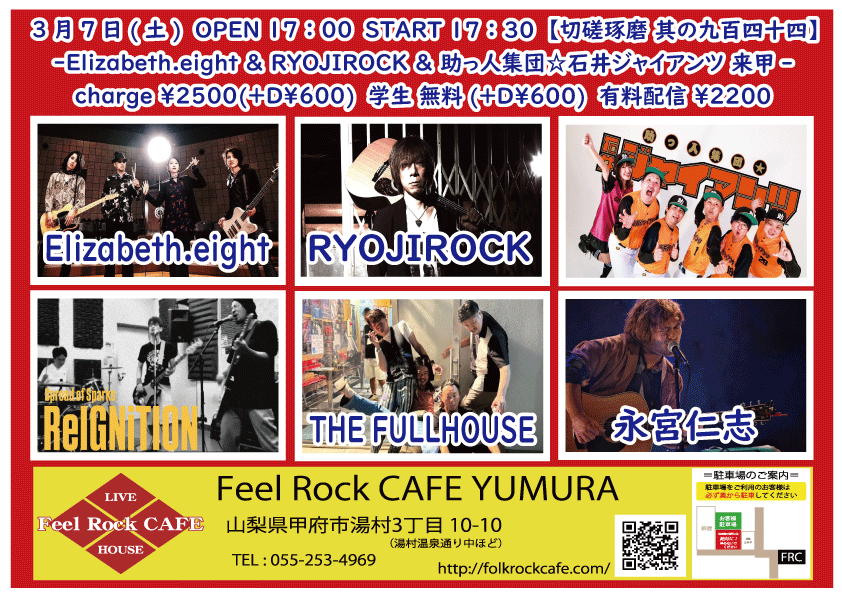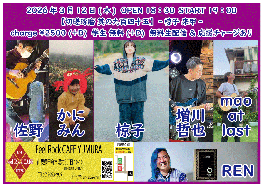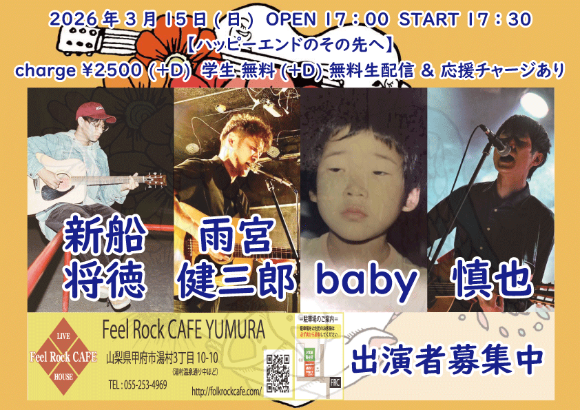 OPEN 17:00START 17:30 チケット前売り ¥2500(+D¥600) 学生 無料(+D¥600) チケット当日 ¥2500(+D¥600) 学生 無料(+D¥600) [出演] 新船将徳(横浜) 慎也 雨宮健三郎 baby …and more!? OPEN 17:00 START 17:30 charge ¥2500(+D¥600) 学生 無料(+D¥600) @Feel Rock CAFE YUMNURA 無料生配信 https://twitcasting.tv/feelrockcafe 応援チャージ・ドリンク差し入れ (アーカイブ視聴可能な合言葉を送ります) https://x.gd/J6D67 ※出演者募集中!! 【チケット予約】 2026-03-20 (金・祝) さとみ & Feel Rock CAFE Presents【HAPPY BIRTH SHOW】-days1 湯村-