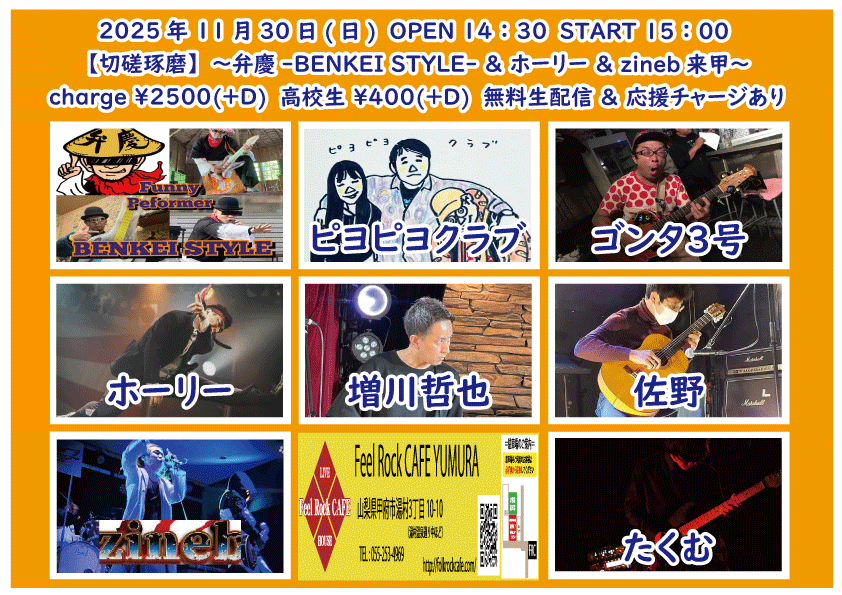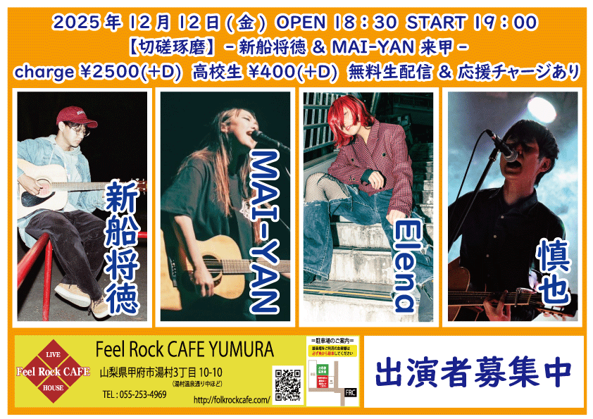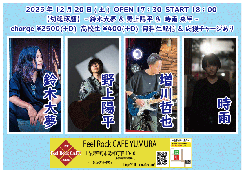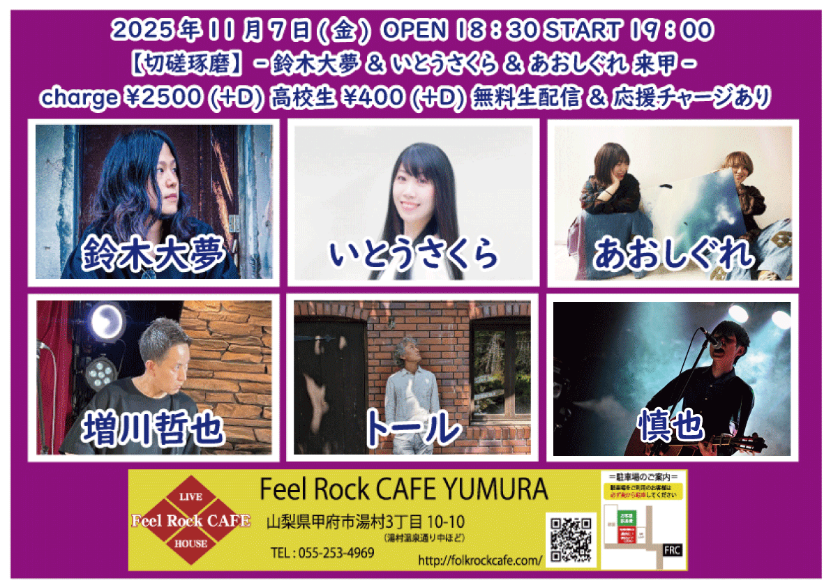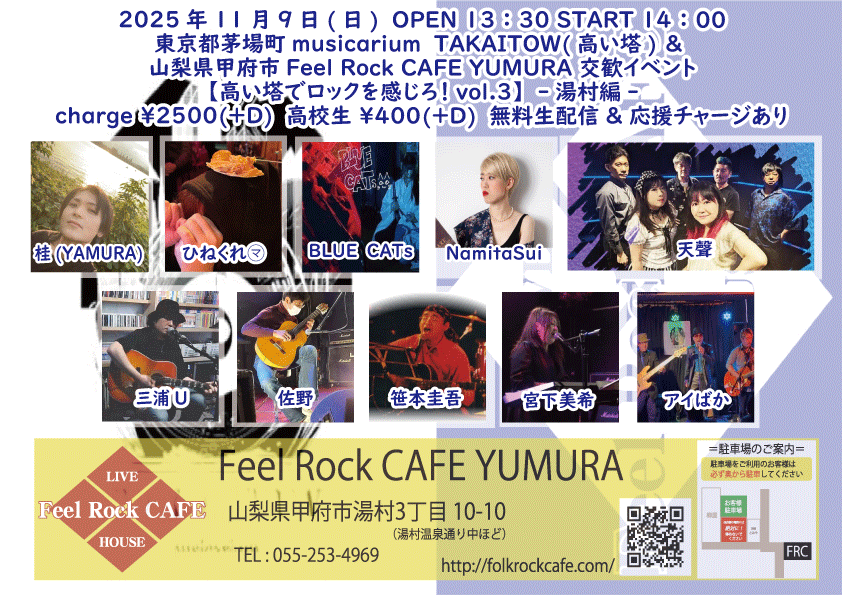 2025-10-19 (日) 【切磋琢磨 其の九百七】 -鈴木NG秀典ーだー。& 青栁智義 & かわいいTAKEOUT 来甲-![]() START 17:00 チケット前売り ¥2500(+D¥600) 高校生 ¥400(+D¥600) チケット当日 ¥2500(+D¥600) 高校生 ¥400(+D¥600) ①17:00-17:35 佐野 ②17:40-18:15 かわいいTAKEOUT(愛知/静岡) ③18:20-18:55 増川哲也 ④19:00-19:35 青栁智義(横浜) ⑤19:40-20:15 鈴木NG秀典ーだー。(静岡) 無料生配信 https://twitcasting.tv/feelrockcafe 応援チャージ・ドリンク差し入れ (アーカイブ視聴可能な合言葉を送ります) https://x.gd/NgcRl 小中学生はドリンク代¥600のみ 未就学児は無料(ドリンク任意) 【チケット予約】 2025-10-25 (土) 【切磋琢磨 其の九百八】-高沢渓太レコ発ツアー & 怜音ーREONー & 荒牧リョウ 来甲 -![]() START 18:00 チケット前売り ¥2500(+D¥600) 高校生 ¥400(+D¥600) チケット当日 ¥2500(+D¥600) 高校生 ¥400(+D¥600) [出演] ①18:00-18:30 リトルアール ②18:35-19:05 怜音ーREONー(千葉) ③19:10-19:40 佐野 ④19:45-20:15 トール ⑤20:20-21:00 荒牧リョウ(東京) ⑥21:05-21:45 高沢渓太(千葉) 無料生配信 https://twitcasting.tv/feelrockcafe 応援チャージ・ドリンク差し入れあり (アーカイブ視聴可能な合言葉を送ります) https://passmarket.yahoo.co.jp/event/show/detail/020nqnj1x8n41.html 小中学生はドリンク代¥600のみ 未就学児は無料(ドリンク任意) 【チケット予約】 2025-10-26 (日) 【Otto Junior Band & Ryota Goto Live tour in japan 2025】![]() START 19:00 チケット前売り ¥4000(+D¥600) チケット当日 ¥4000(+D¥600) [出演] Otto Junior Band & Ryota Goto 【チケット予約】 2025-10-31 (金) 【㊗Bトラクターズ 結成30周年 スペシャルLIVE】![]() START 19:00 チケット前売り ¥1500(+D¥600) 高校生 ¥500 チケット当日 ¥2000(+D¥600) 高校生 ¥500 [出演] Bトラクターズ 【チケット予約】 2025-11-01 (土) 「Piece The Music vol.22」~Yamanashi special~![]() START 17:30 チケット前売り ¥3000(+D¥600) チケット当日 ¥3500(+D¥600) [出演] heana 常盤侑希 高尾彩佳 朝倉くるみ YURIKA 小豆沢あずき feat. DJ AKISUKE 加藤大吾 有料配信 ¥1650(パスマーケット手数料込み) https://x.gd/u2K3w 【チケット予約】 2025-11-02 (日) <中島卓偉 弾き語りTOUR ALL AROUND THE JAPAN 〜Season3〜>![]() START 14:00 チケット前売り SOLD OUT チケット当日 なし ※整理番号付き・全自由席 ※年齢制限3歳以上有料 こちらのチケット予約は受け付けておりません。 【チケット予約】 2025-11-07 (金) 【切磋琢磨 其の九百九】 -鈴木大夢 & いとうさくら & あおしぐれ 来甲-![]() START 19:00 チケット前売り ¥2500(+D¥600) 高校生 ¥400(+D¥600) チケット当日 ¥2500(+D¥600) 高校生 ¥400(+D¥600) [出演] ①19:00-19:30 トール ②19:35-20:10 あおしぐれ(横浜) ③20:15-20:45 増川哲也 ④20:50-21:25 いとうさくら(三重) ⑤21:30-22:00 慎也 ⑥22:05-22:40 鈴木大夢(名古屋) 無料生配信 https://twitcasting.tv/feelrockcafe 応援チャージ・ドリンク差し入れ (アーカイブ視聴可能な合言葉を送ります) https://x.gd/9iGnV 小中学生はドリンク代¥600のみ 未就学児は無料(ドリンク任意) 【チケット予約】 2025-11-08 (土) 【切磋琢磨 其の九百十】 -西森シンタロヲ & 夏。& よう 来甲-![]() START 18:00 チケット前売り ¥2500(+D¥600) 高校生 ¥400(+D¥600) チケット当日 ¥2500(+D¥600) 高校生 ¥400(+D¥600) [出演] 西森シンタロヲ(愛知) 夏。(愛知) よう(愛知) 佐野 増川哲也 …and more!!! 無料生配信&応援チャージ・ドリンク差し入れあり ※出演者募集中!! 【チケット予約】 2025-11-09 (日) Feel Rock CAFE YUMURA & 東京茅場町musicariumTAKAITOW(高い塔) 交歓イベント 【高い塔でロックを感じろ!vol.3】-湯村編-![]() START 14:00 チケット前売り ¥2500(+D¥600) 高校生 ¥400(+D¥600) チケット当日 ¥2500(+D¥600) 高校生 ¥400(+D¥600) ①14:00-14:25 天聲 ②14:35-15:00 佐野 ③15:05-15:30 三浦U ④15:35-16:00 笹本圭吾 ⑤16:05-16:30 ひねくれ㋮ ⑥16:35-17:00 アイばか ⑦17:05-17:30 BLUECATs ⑧17:35-18:00 宮下美希 ⑨18:05-18:30 桂(YAMURA) ⑩18:35-19:00 NamitaSui 無料生配信 https://twitcasting.tv/feelrockcafe 応援チャージ・ドリンク差し入れ (アーカイブ視聴可能な合言葉を送ります) https://x.gd/pMUou 【チケット予約】 2025-11-14 (金) 【切磋琢磨 其の九百十一】-飛知和恵次 来甲-![]() START 19:00 チケット前売り ¥2500(+D¥600) 高校生 ¥400(+D¥600) チケット当日 ¥2500(+D¥600) 高校生 ¥400(+D¥600) [出演] 飛知和恵次(静岡) マリナーズ 増川哲也 かにみん …and more!!! 応援チャージ・ドリンク差し入れあり ※出演者募集中!! 【チケット予約】 2025-11-15 (土) 切磋琢磨 其の九百十二】-アラレ大作戦 全身全霊ツアー & 開ハ散ル & ユータ 来甲-![]() START 18:00 チケット前売り ¥2500(+D¥600) 高校生 ¥400(+D¥600) チケット当日 ¥2500(+D¥600) 高校生 ¥400(+D¥600) [出演] アラレループ(埼玉) 開ハ散ル(千葉) ユータ(静岡) Visionary …and more!!! 無料生配信&応援チャージ・ドリンク差し入れあり ※出演者募集中!! 【チケット予約】 2025-11-22 (土) 切磋琢磨 其の九百十四】 -1メートルの渋滞 レコ発ツアー & ユータ & 黒猫のミヤ 来甲-![]() START 19:00 チケット前売り ¥2500(+D¥600) 高校生 ¥400(+D¥600) チケット当日 ¥2500(+D¥600) 高校生 ¥400(+D¥600) [出演] ①19:00-19:30 増川哲也 ②19:35-20:05 黒猫のミヤ ③20:10-20:40 永瀬楓 ④20:45-21:15 ユータ ⑤21:20-21:50 ⑥22:00-22:30 1
