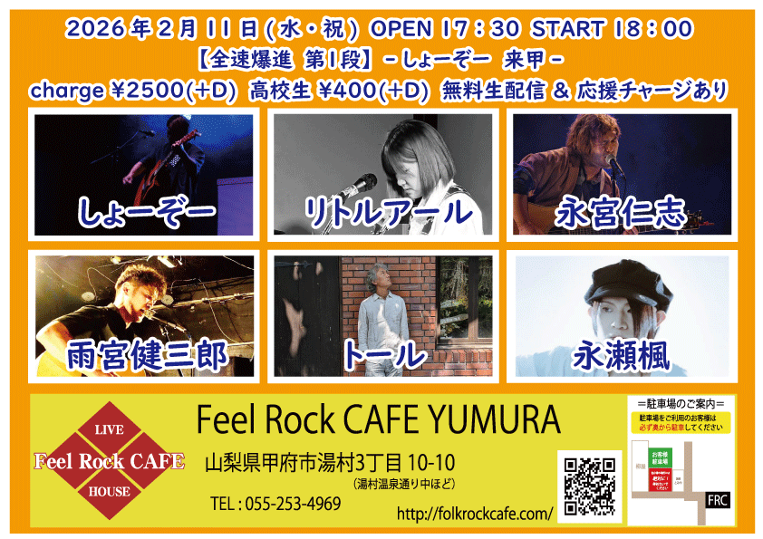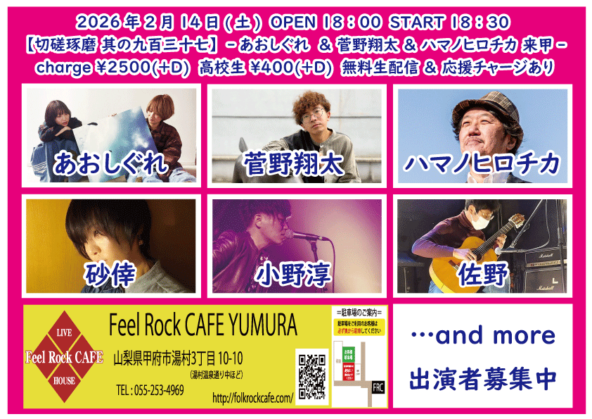 OPEN 19:00START 19:30 チケット前売り ¥4000(+D¥600) チケット当日 ¥4000(+D¥600) [出演] ①19:30-20:00 永瀬楓 ②20:05-20:35 Dur moll ③20:40-21:10 MIYA ④21:15-22:15 我孫子神音曾 ⑤22:15-22:30 セッション [入場順] ①各アーティスト予約並列整理番号順 ②お店予約 配信あり(詳細後日) 【チケット予約】 2026-02-11 (水) 【全速爆進第1段】-しょーぞー 来甲 -START 18:00 チケット前売り ¥2500(+D¥600) 高校生 ¥400(+D¥600) チケット当日 ¥2500(+D¥600) 高校生 ¥400(+D¥600) OA:17:45-17:55 AKISUKE ①18:00-18:30 リトルアール ②18:35-19:05 雨宮健三郎 ③19:10-19:40 永瀬楓 ④19:45-20:15 トール ⑤20:20-20:50 しょーぞー(静岡) ⑥20:55-21:25 永宮仁志 無料生配信 https://twitcasting.tv/feelrockcafe 応援チャージ・ドリンク差し入れあり (アーカイブ視聴可能な合言葉を送ります) 小中学生はドリンク代¥600のみ 未就学児は無料(ドリンク任意) 【チケット予約】 2026-02-14 (土) 【切磋琢磨 其の九百三十八】-あおしぐれ & 菅野翔太 & ハマノヒロチカ 来甲-