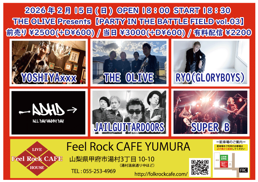 OPEN 18:00START 18:30 チケット前売り ¥2500(+D¥600) 高校生 ¥400(+D¥600) チケット当日 ¥2500(+D¥600) 高校生 ¥400(+D¥600) [出演] ①18:30-18:55 佐野 ②19:00-19:35 菅野翔太(横浜) ③19:40-20:15 砂倖 ④20:20-20:55 ハマノヒロチカ(東京) ⑤21:00-21:35 あおしぐれ(横浜) ⑥21:40-22:15 小野淳 無料生配信 https://twitcasting.tv/feelrockcafe 応援チャージ・ドリンク差し入れあり (アーカイブ視聴可能な合言葉を送ります) https://x.gd/fU0hx 小中学生はドリンク代¥600のみ 未就学児は無料(ドリンク任意) 【チケット予約】 2026-02-15 (日) THE OLIVE Presents【PARTY IN THE BATTLE FIELD vol.03】