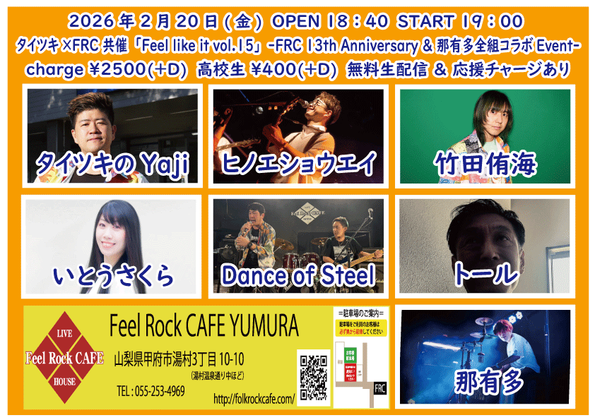 OPEN 18:40START 19:00 チケット前売り ¥2500(+D¥600) 高校生 ¥400(+D¥600) チケット当日 ¥2500(+D¥600) 高校生 ¥400(+D¥600) [出演] ①19:00-19:20 那有多(大阪) ②19:25-19:50 トール ③19:55-20:25 ヒノエショウエイ(日本) ④20:30-21:00 竹田侑海(栃木) ⑤21:05-21:30 Dance of Steel ⑥21:35-22:05 いとうさくら(三重) ⑦22:10-22:40 タイツキのYaji(東京) 無料生配信 https://twitcasting.tv/feelrockcafe 応援チャージ・ドリンク差し入れあり (アーカイブ視聴可能な合言葉を送ります) https://x.gd/gDwPa 小中学生はドリンク代¥600のみ 未就学児は無料(ドリンク任意) 【チケット予約】 2026-02-21 (土) 【切磋琢磨 其の九百三十九】-Feel Rock CAFE 13th Anniversary Event-