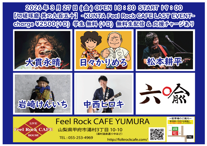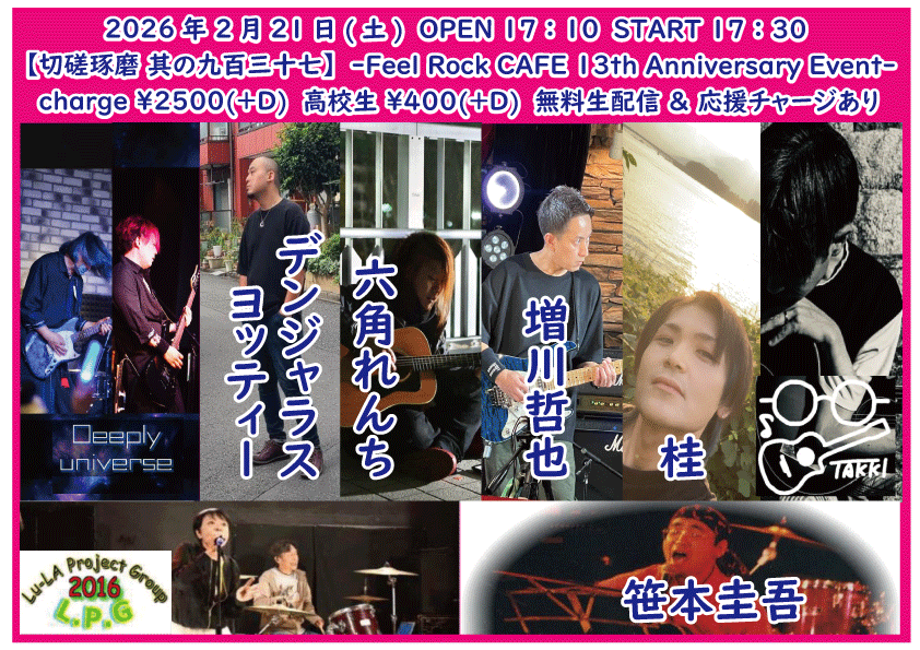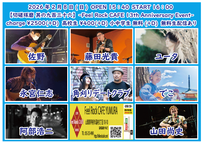 OPEN 15:40START 16:00 チケット前売り ¥2500(+D¥600) 高校生 ¥400(+D¥600) チケット当日 ¥2500(+D¥600) 高校生 ¥400(+D¥600) [出演] ①16:00-16:25 佐野 ②16:30-17:00 藤田光貴 ③17:05-17:40 ユータ(静岡) ④17:45-18:15 永宮仁志 ⑤18:20-18:55 角刈りデートクラブ(神奈川) ⑥19:00-19:30 でこ ⑦19:35-20:10 阿部浩二(日本) ⑧20:15-20:50 山田尚史(神奈川) 無料生配信 https://twitcasting.tv/feelrockcafe 応援チャージ・ドリンク差し入れ (アーカイブ視聴可能な合言葉を送ります) https://x.gd/3O1kA 【チケット予約】 2026-02-10 (火・祝前日) 【切磋琢磨 其の九百三十七】-Feel Rock CAFE 13th Anniversar Birthday Event-