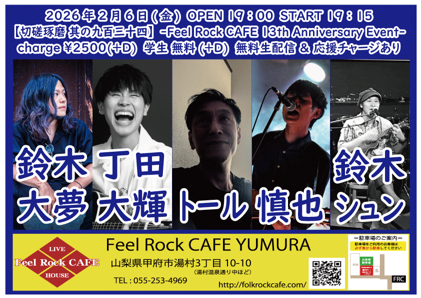 OPEN 19:00START 19:15 チケット前売り ¥2500(+D¥600) 学生 無料(+D¥600) チケット当日 ¥2500(+D¥600) 学生 無料(+D¥600) [出演] ①19:15-19:50 トール ②19:55-20:30 丁田大輝(愛知) ③20:35-21:10 鈴木シュン ④21:15-21:50 慎也 ⑤21:55-22:40 鈴木大夢(名古屋) 無料生配信 https://twitcasting.tv/feelrockcafe 応援チャージ・ドリンク差し入れ (アーカイブ視聴可能な合言葉を送ります) https://x.gd/shku3 【チケット予約】 2026-02-07 (土) 【切磋琢磨 其の九百三十五】 -Feel Rock CAFE 13th Anniversary Event-