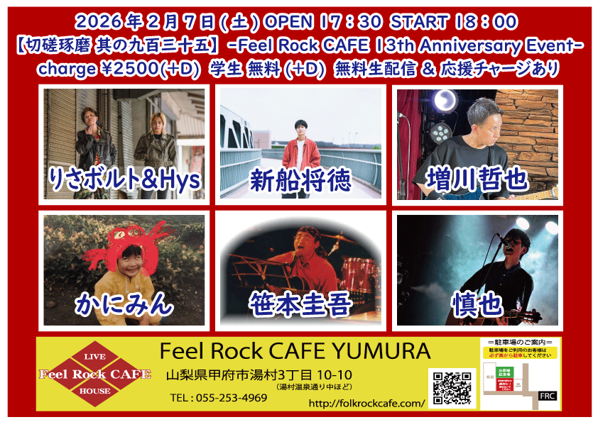 OPEN 17:30START 18:00 チケット前売り ¥2500(+D¥600) 学生 無料(+D¥600) チケット当日 ¥2500(+D¥600) 学生 無料(+D¥600) [出演] ①18:00-18:30 かにみん ②18:35-19:05 笹本圭吾 ③19:10-19:40 増川哲也 ④19:45-20:15 慎也 ⑤20:20-21:05 新船将徳(横浜) ⑥21:10-21:55 りさボルト&Hys(埼玉) 無料生配信 https://twitcasting.tv/feelrockcafe 応援チャージ・ドリンク差し入れ (アーカイブ視聴可能な合言葉を送ります) https://x.gd/tBgDv 【チケット予約】 2026-02-08 (日) 【切磋琢磨 其の九百三十六】-Feel Rock CAFE 13th Anniversary Event-