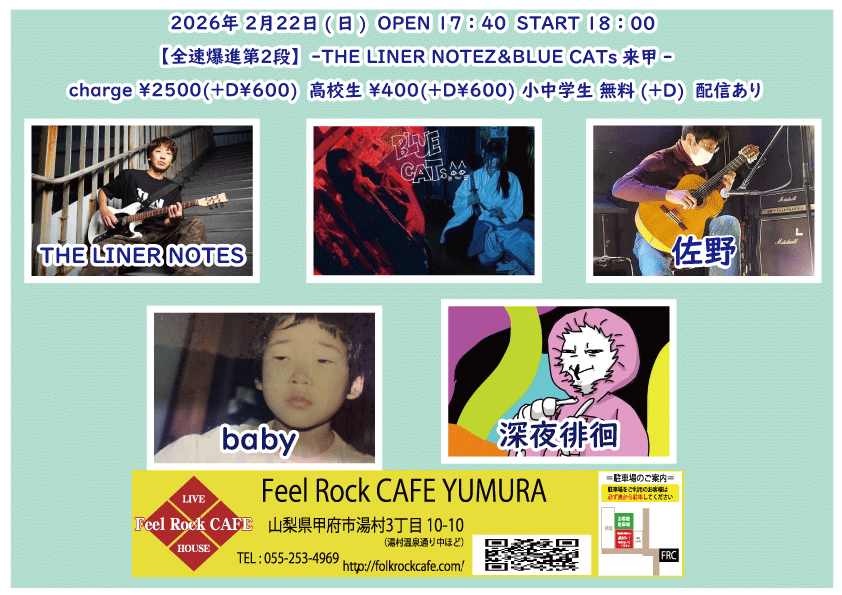 OPEN 17:30START 18:00 チケット前売り ¥2500(+D¥600) 高校生 ¥400(+D¥600) チケット当日 ¥2500(+D¥600) 高校生 ¥400(+D¥600) [出演] ①18:00-18:30 佐野 ②18:35-19:05 深夜徘徊 ③19:10-19:40 BLUE CATs (東京) ④19:45-20:15 THE LINER NOTEZ(東京) ⑤20:20-20:50 baby 無料生配信 https://twitcasting.tv/feelrockcafe 応援チャージ・ドリンク差し入れあり (アーカイブ視聴可能な合言葉を送ります) 小中学生はドリンク代¥600のみ 未就学児は無料(ドリンク任意) 【チケット予約】 2026-02-27 (金) 【切磋琢磨 其の九百三十九】 -Feel Rock CAFE 13th Anniversary Event-