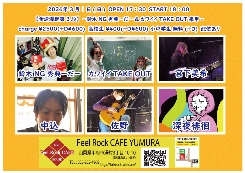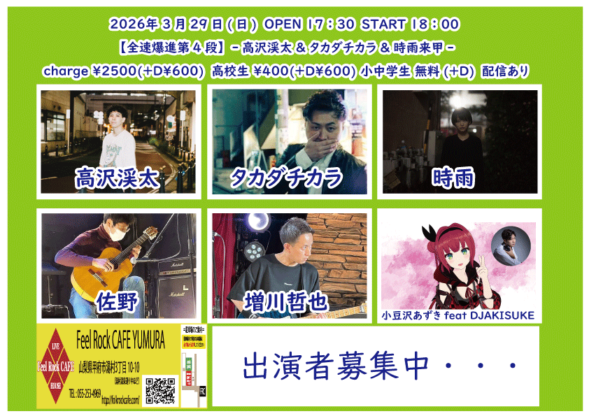 OPEN 17:40START 18:00 チケット前売り ¥2500(+D¥600) 学生 無料(+D¥600) チケット当日 ¥2500(+D¥600) 学生 無料(+D¥600) [出演] ①19:00-19:30 こーたろー ②19:35-20:05 増川哲也 ③20:10-20:55 雪乃(神奈川) ④21:00-21:45 月ノ雫(東京) ⑤21:50-22:35 ユータ(静岡) 無料生配信 https://twitcasting.tv/feelrockcafe 応援チャージ・ドリンク差し入れあり (アーカイブ視聴可能な合言葉を送ります) https://x.gd/Cevym 未就学児は無料(ドリンク任意) 【チケット予約】 2026-03-01 (日) 【全速爆進第3段】-鈴木NG秀典ーだー & かわいいTAKE OUT来甲-