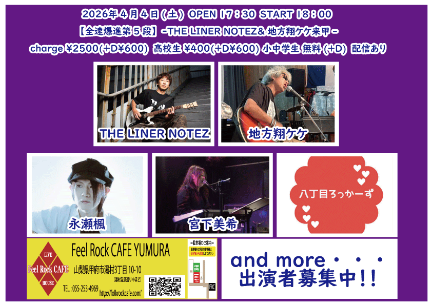 OPEN 17:30START 18:00 チケット前売り ¥2500(+D¥600) 学生 無料(+D¥600) チケット当日 ¥2500(+D¥600) 学生 無料(+D¥600) ①18:00-18:30 宮下美希 ②18:35-19:05 地方翔ケケ ③19:10-19:40 永瀬楓 ④19:45-20:15THE LINER NOTEZ ⑤20:20-20:50 八丁目ロッカーズ ※21:00-21:30 物販・精算 ※21:30-22:00 アフターパーティー準備 ※22:00-24:00 アフターパーティー ¥2000(フード・1D込) 2杯目以降キャッシュ charge ¥2500(+D¥600) 高校生 ¥400(+D¥600) @Feel Rock CAFE YUMURA 無料生配信 https://twitcasting.tv/feelrockcafe 応援チャージ・ドリンク差し入れ (アーカイブ視聴可能な合言葉を送ります) 小中学生はドリンク代¥600のみ 未就学児は無料(ドリンク任意) 【チケット予約】 |