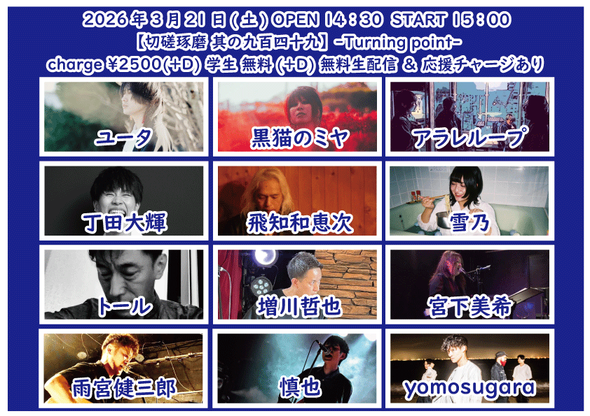 OPEN 17:40START 18:00 チケット前売り ¥2500(+D¥600) 高校生 ¥400(+D¥600) チケット当日 ¥2500(+D¥600) 高校生 ¥400(+D¥600) [出演] ①18:00-18:25 リトルアール ②18:30-18:55 永瀬楓 ③19:00-19:25 増川哲也 ④19:30-20:05 ユータ ⑤20:10-20:35 雨宮健三郎 ⑥20:40-21:05 永宮仁志 ⑦21:10-21:45 江崎掌 ⑧21:50-22:25 鈴木大夢 無料生配信 https://twitcasting.tv/feelrockcafe 応援チャージ・ドリンク差し入れあり (アーカイブ視聴可能な合言葉を送ります) URL後日公開 小中学生はドリンク代¥600のみ 未就学児は無料(ドリンク任意) 【チケット予約】 2026-03-21 (土) 【切磋琢磨 其の九百四十九】-Turning point-