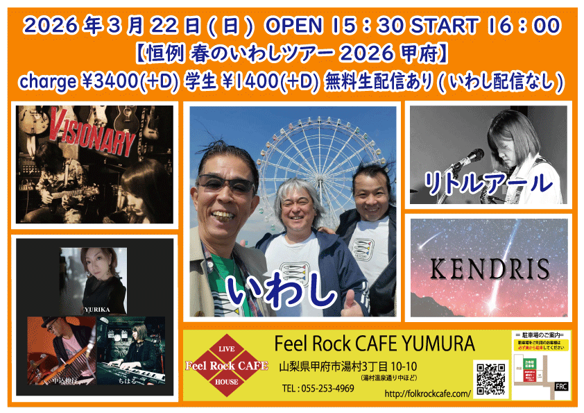OPEN 15:30START 16:00 チケット前売り ¥3400(+D¥600) 学生 ¥1400(+D¥600) チケット当日 ¥3400(+D¥600) 学生 ¥1400(+D¥600) ①16:00-16:30 Kendris ②16:40-17:10 リトルアール ③17:15-17:45 VISIONARY ④17:50-18:20 YURIKA ⑤18:30-20:00 いわし(配信なし) 無料生配信 https://twitcasting.tv/feelrockcafe 応援チャージ・ドリンク差し入れ (アーカイブ視聴可能な合言葉を送ります) https://x.gd/bNl3r 【チケット予約】 2026-03-27 (金) 【切磋琢磨 其の九百五十】 -くんた Feel Rock CAFE LAST EVENT-